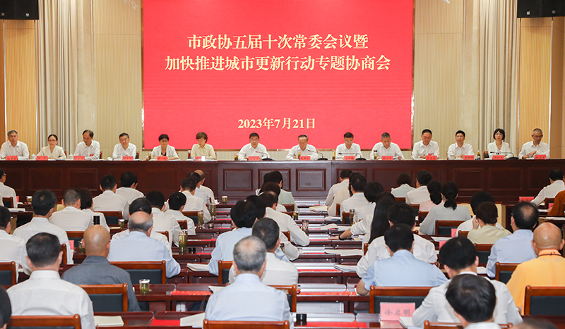 7月21日上午,市政协五届十次常委会议暨加快推进城市更新行动专题协商会召开。市委副书记、市长朱浩东,市政协主席张夏林出席会议并讲话,市委副书记、市委宣传部部长田昕,副市长胡军保,市政协副主席贾瑄、张士平、刘会秋、丁志友、赵恩来、吴明楣、程平,一级巡视员周珍花,市政协秘书长王春生出席会议。
